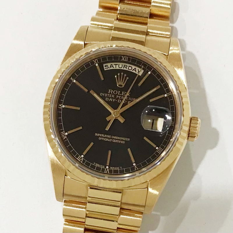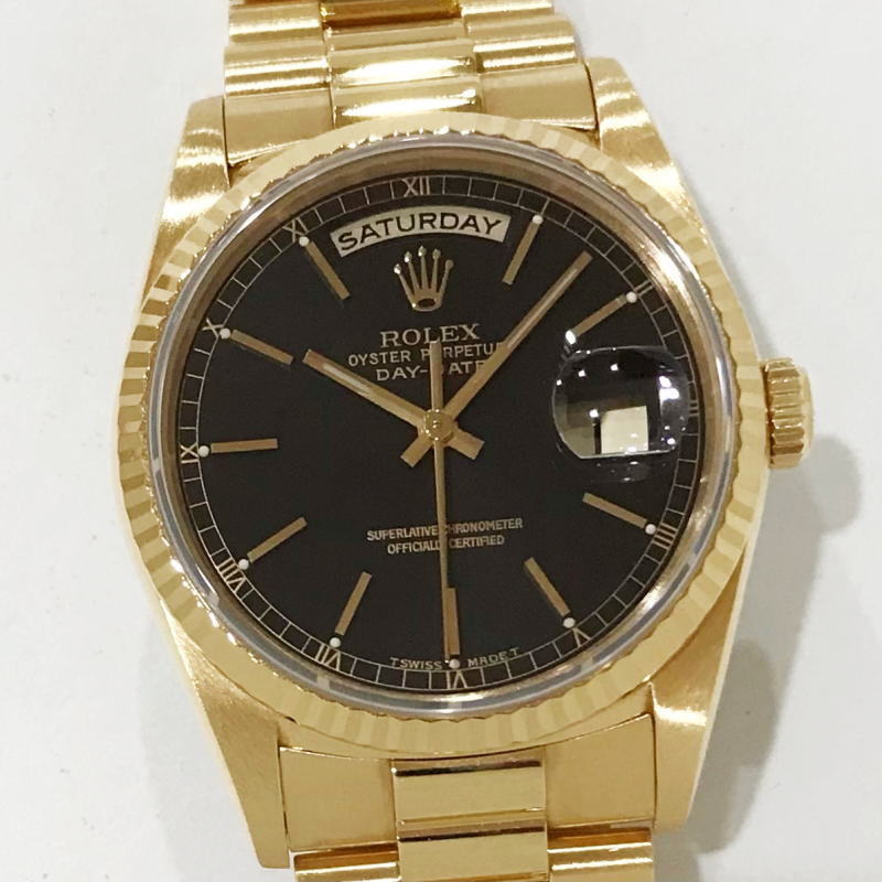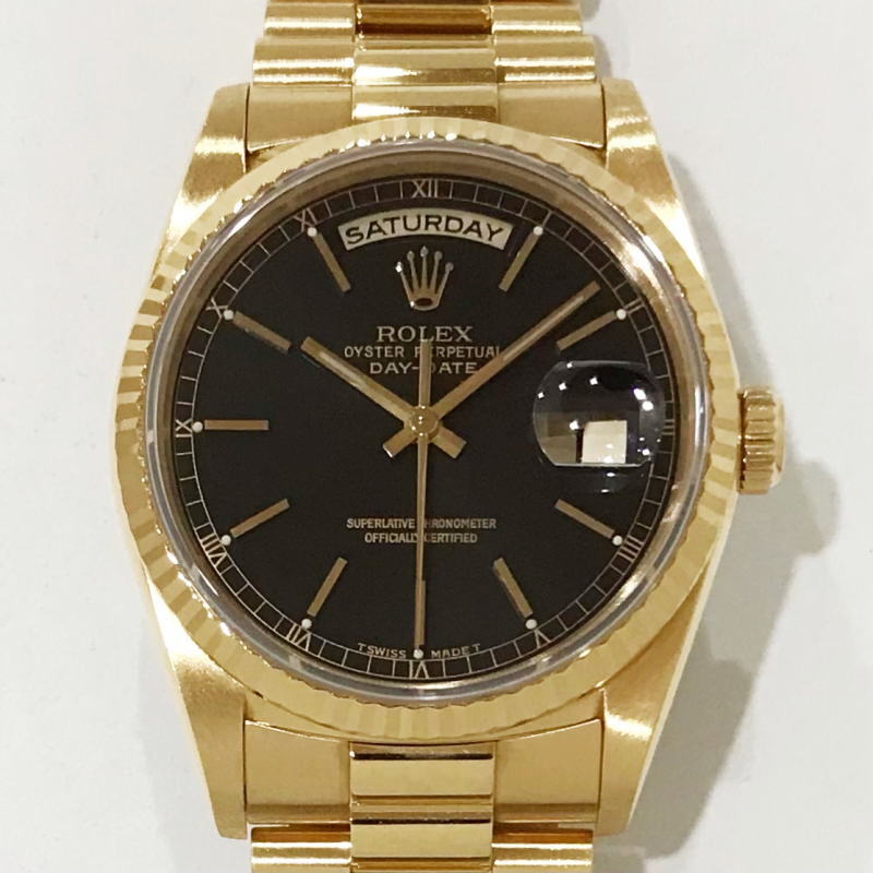 ケース/ダイヤル/ハンド/ブレスレット トータルのコンディションが良く、フォルム/シェイプをキープした デイデイト 18238 黒文字盤です。